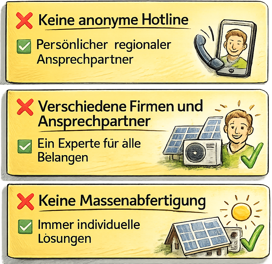 Während viele Anbieter mit Standardpaketen arbeiten, entwickeln wir für Ihr Zuhause ein passendes Energiekonzept – persönlich, regional und mit einem zentralen Ansprechpartner von der Beratung bis zur Umsetzung.